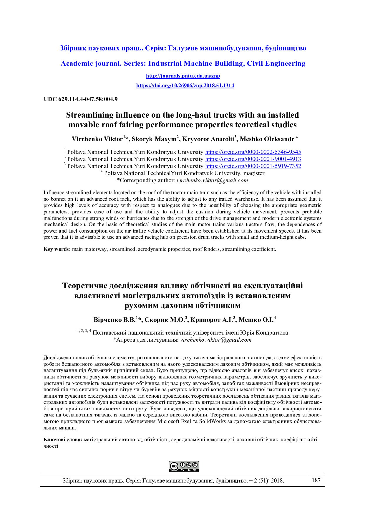 Streamlining influence on the long-haul trucks with an installed movable roof fairing performance properties teoretical studies