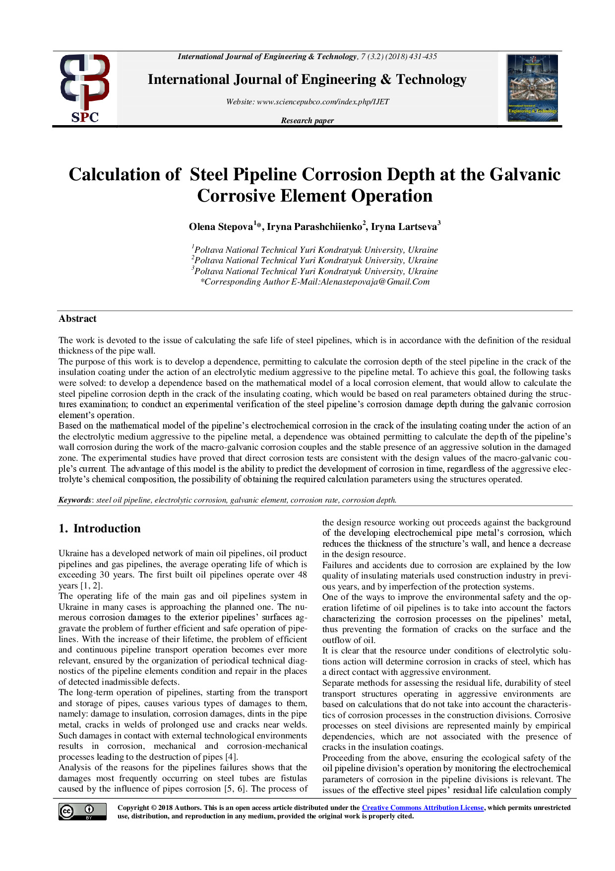 Stepova O.V. Calculation of steel pipeline corrosion depth at the work of galvanic corrosion element operating / O.V. Stepova, I.M. Parashchiienko, I.I. Lartseva // International Journal of Engineering & Technology. - 2018. - Vol.7, No3.2. - P.431-435