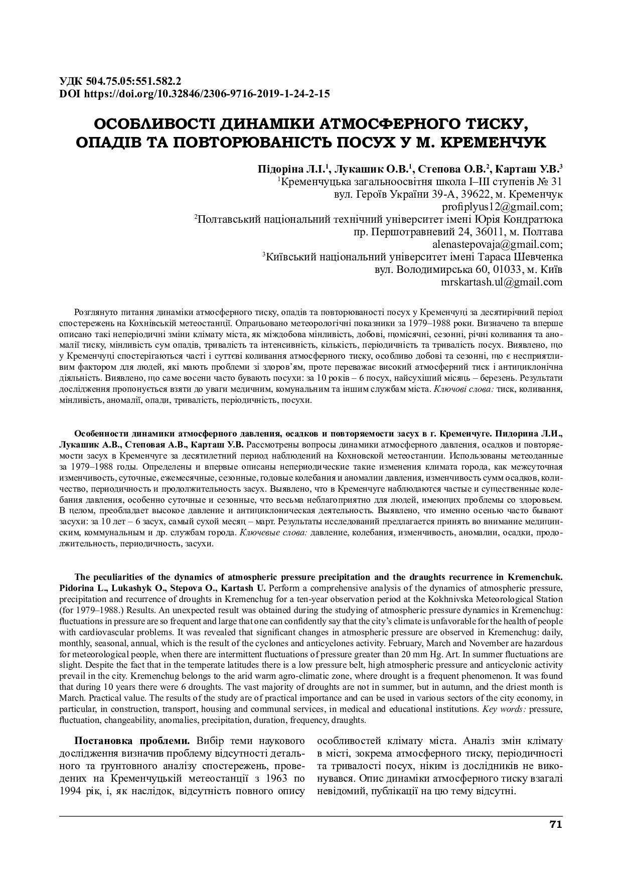 Особливості динаміки атмосферного тиску, опадів та повторюваність посух у м. Кременчуці
