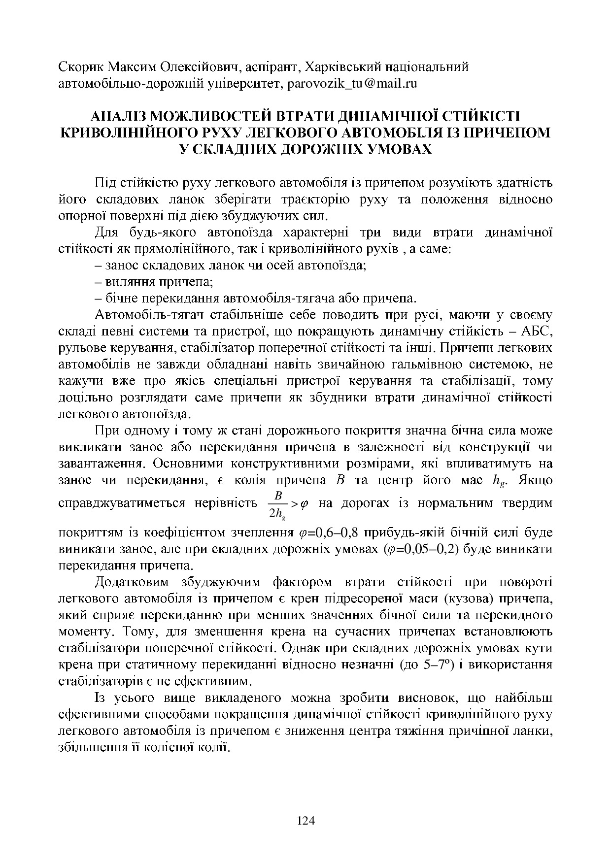 Аналіз можливостей втрати динамічної стійкості криволінійного руху легкового автомобіля із причепом у складних дорожніх умовах