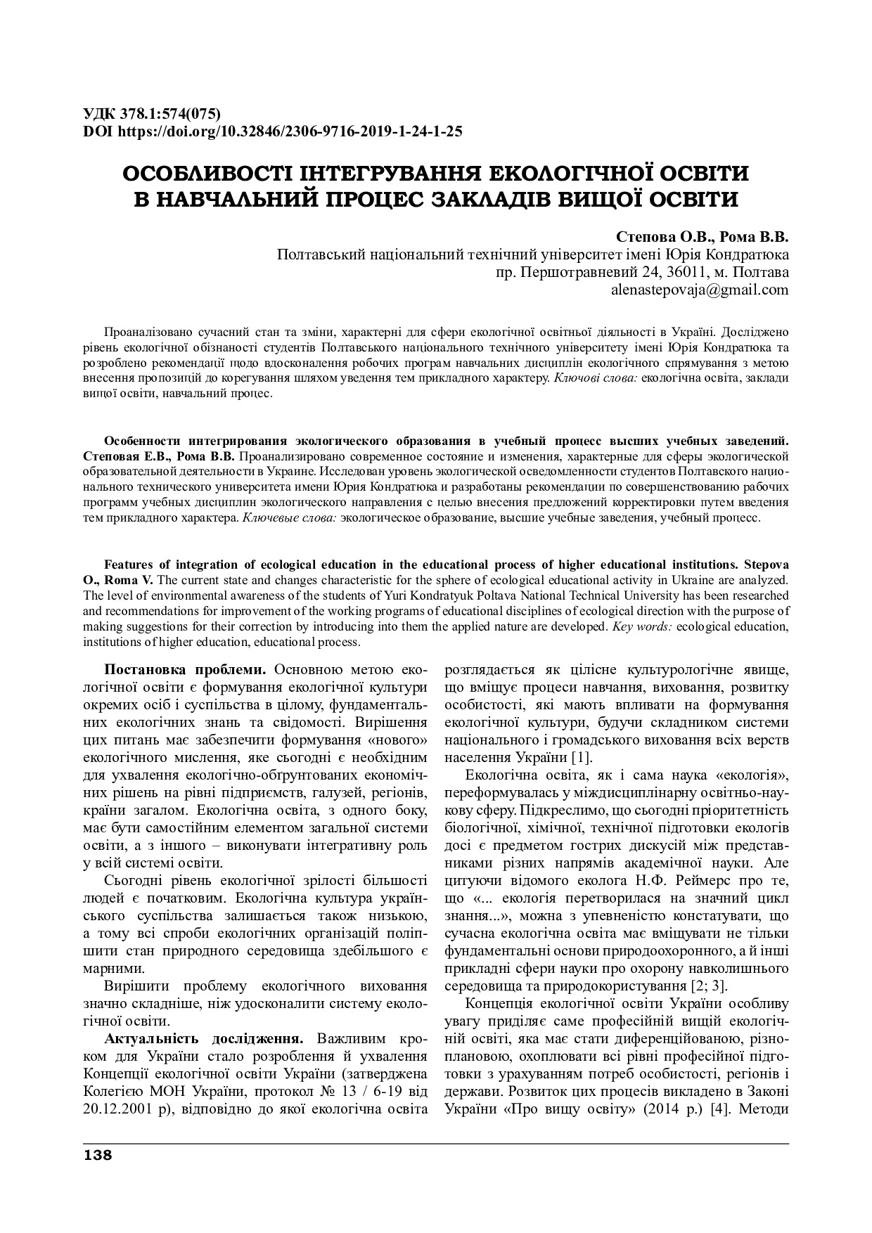 Особливості інтегрування екологічної освіти в навчальний процес закладів вищої освіти