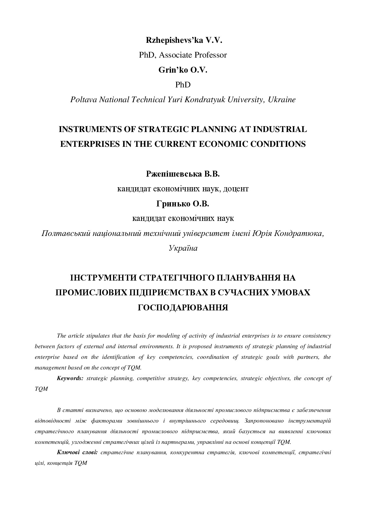 Інструменти стратегічного планування на промислових підприємствах в сучасних умовах господарювання