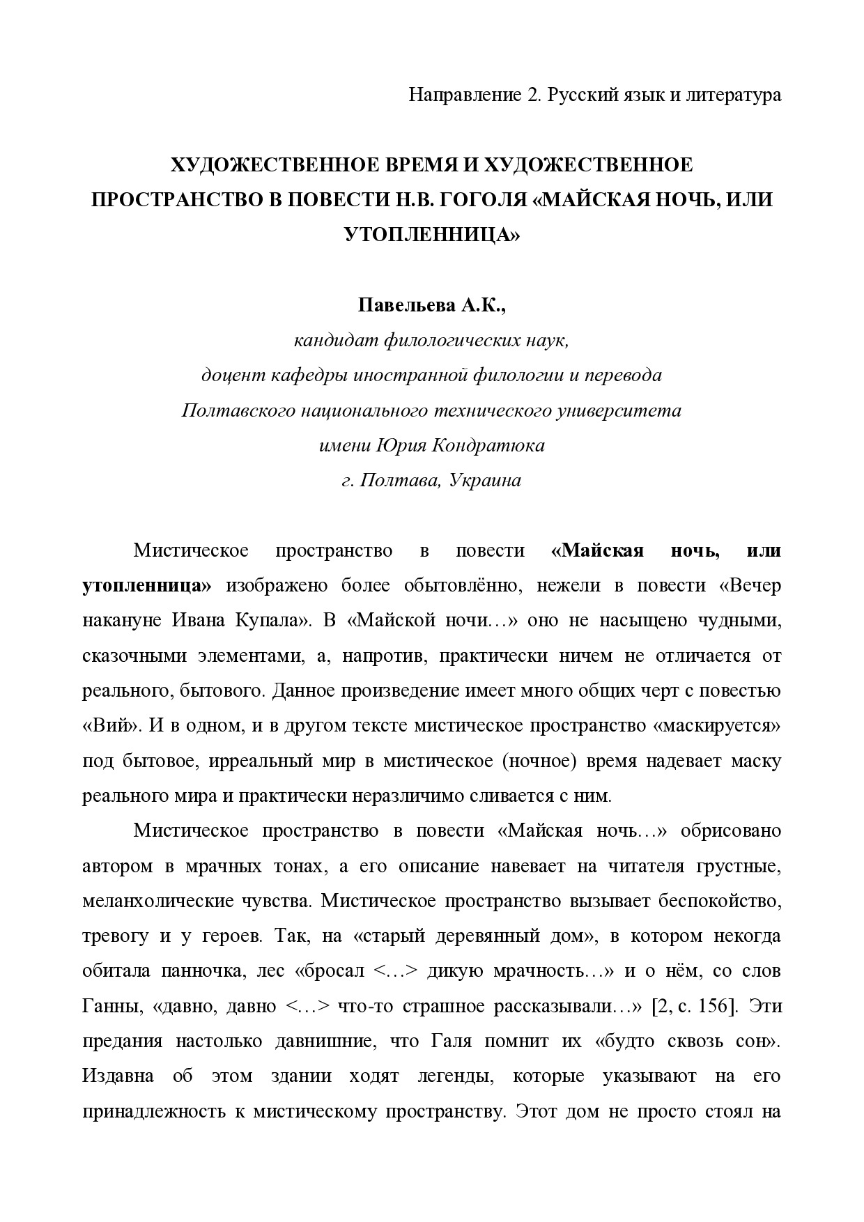 Павельева А.К. Художественное время и художественное пространство в повести Н.В. Гоголя «Майская ночь, или утопленница» / А.К. Павельева // Стратегії розвитку та пріоритетні завдання філологічних наук : матеріали Всеукр. наук.-практ. конф., 19 – 20 жовт. 2018 р. – Запоріжжя : Класич. приват. ун-т, 2018. – С. 28–32.