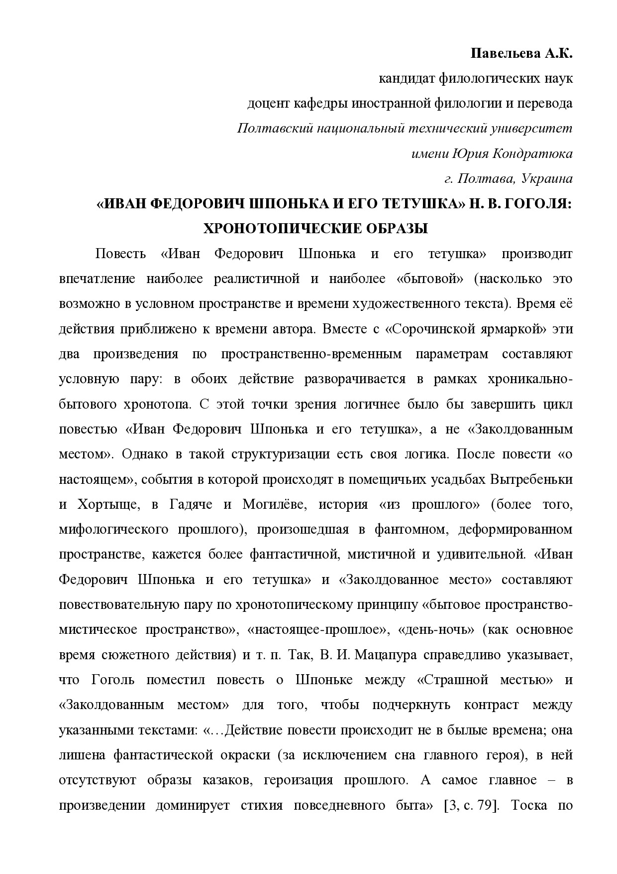 «Иван Федорович Шпонька и его тетушка» Н.В. Гоголя: хронотопические образы