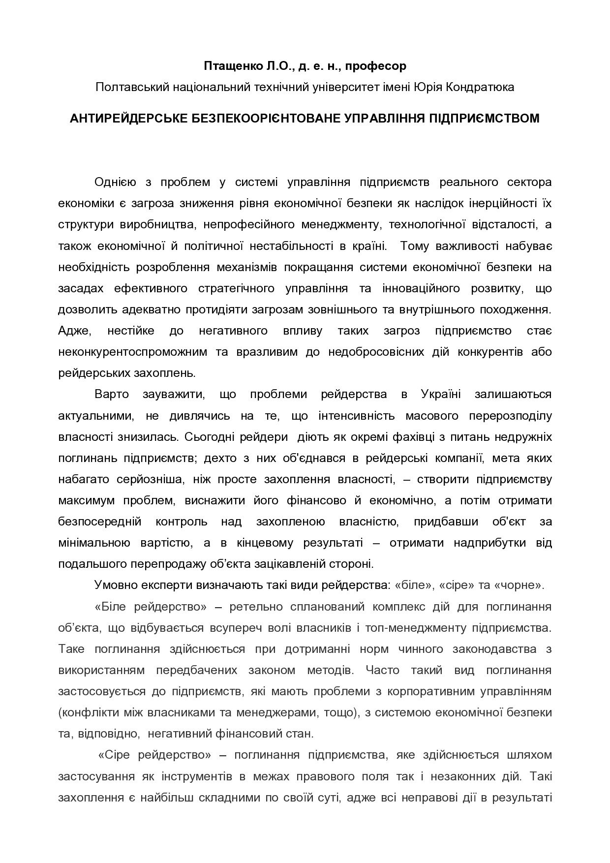 Антирейдерське безпекоорієнтоване управління підприємством
