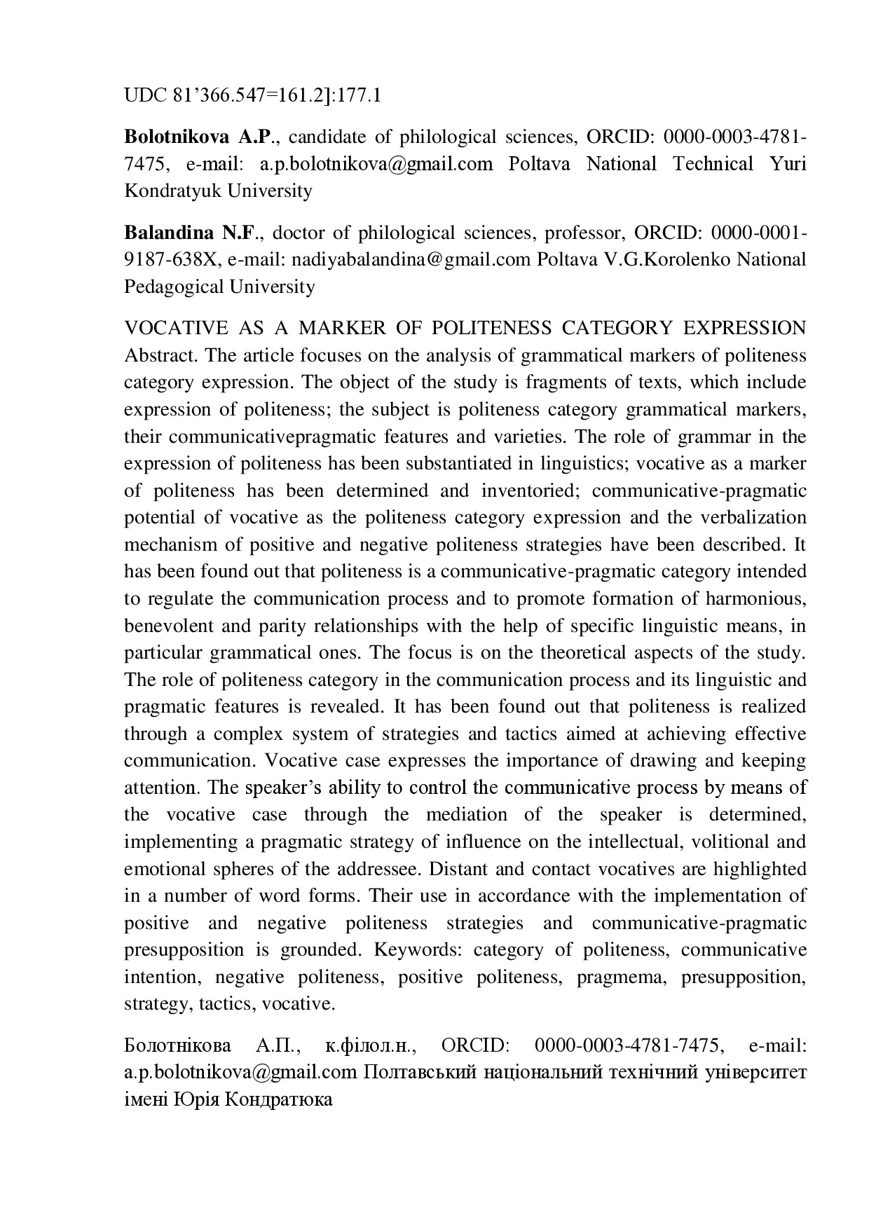 Bolotnikova A.P. Vocative as a marker of politeness category expression / A.P. Bolotnikova, N.F. Balandina // Technology, Engineering and Science – 2018 : зб. наук. пр. І Міжнар. наук.-практ. конф., Лондон, 24 – 25 жовт. 2018 р. – Полтава : ПолтНТУ, 2018. – С. 198-200.