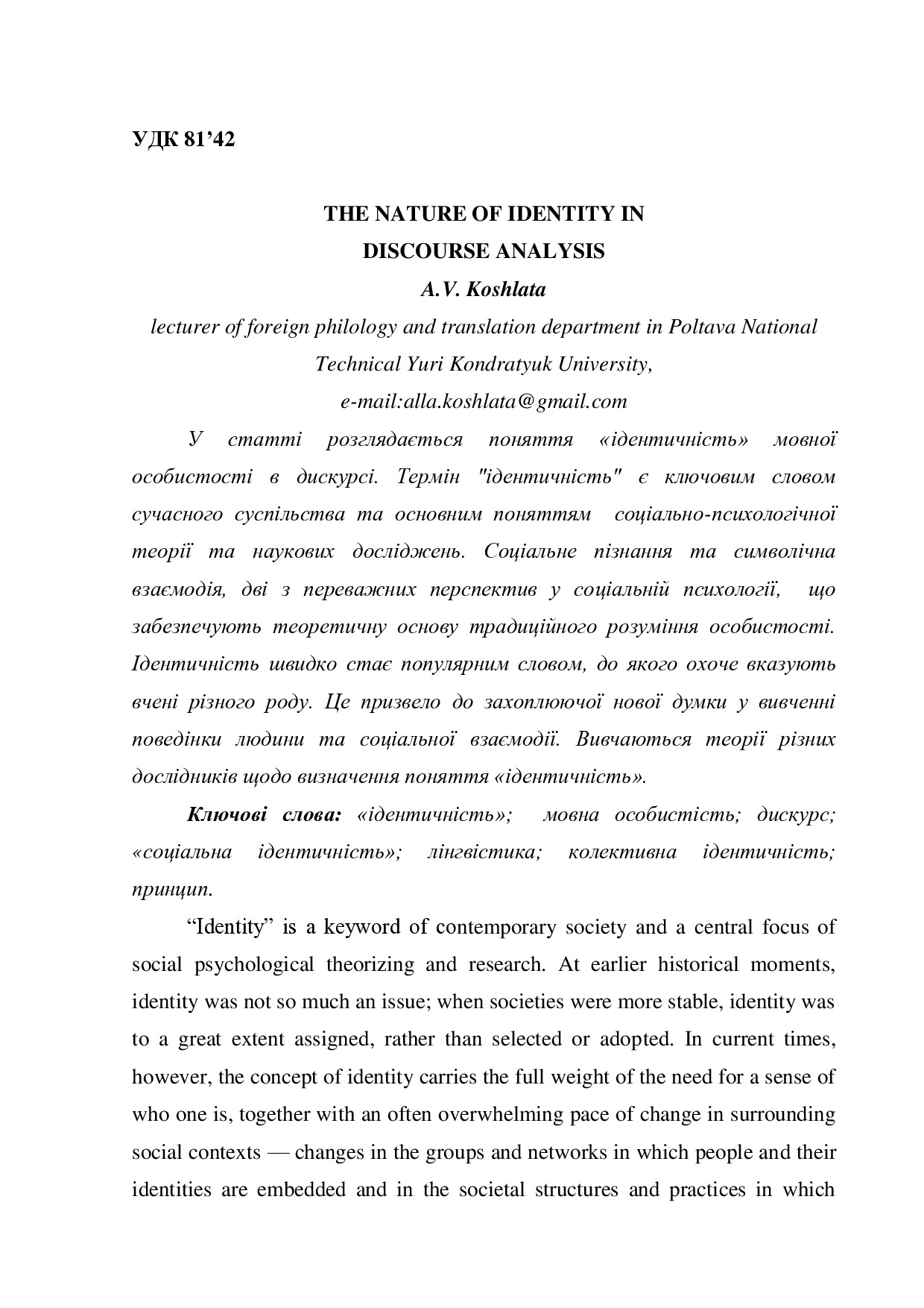 Koshlata. A.V. The nature of identity in discourse analysis/ A.V. Koshlata // Гуманітарний вісник Полтав. нац. техн. ун-ту ім. Юрія Кондратюка : зб. наук. праць. – Полтава : ПолтНТУ, 2017. – Вип. 2. – С. 167-176.