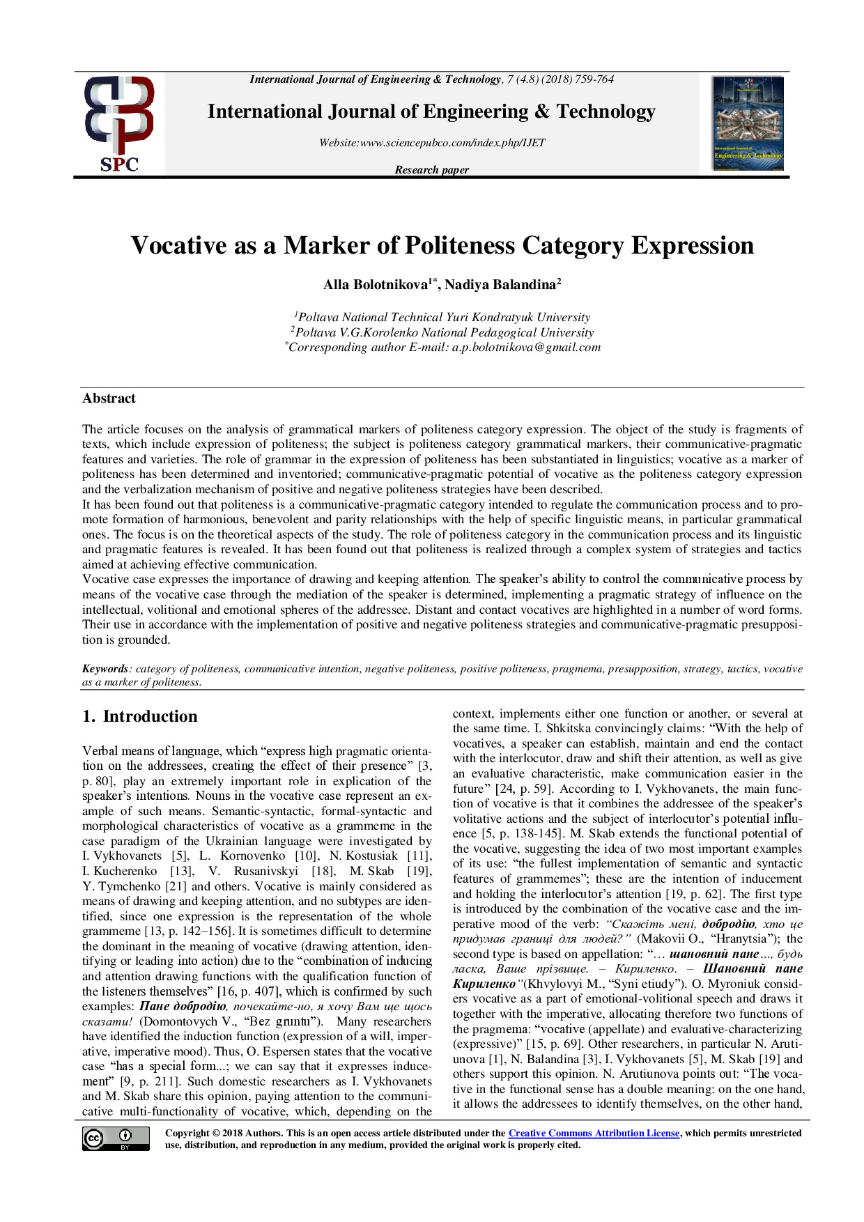 Bolotnikova А.P. Vocative as a Marker of Politeness Category / A.P. Bolotnikova, N.F. Balandina // International Journal of Engineering & Technology. – 2018. – Vol. 7, № 4.8. – P. 759-764.