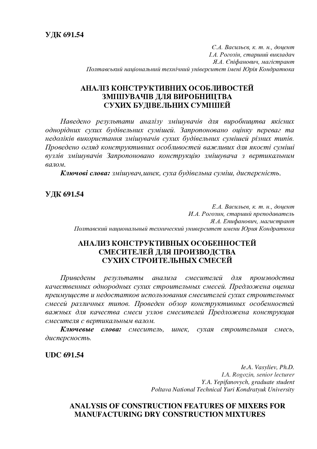Аналіз конструктивних особливостей змішувачів для виробництва сухих будівельних сумішей