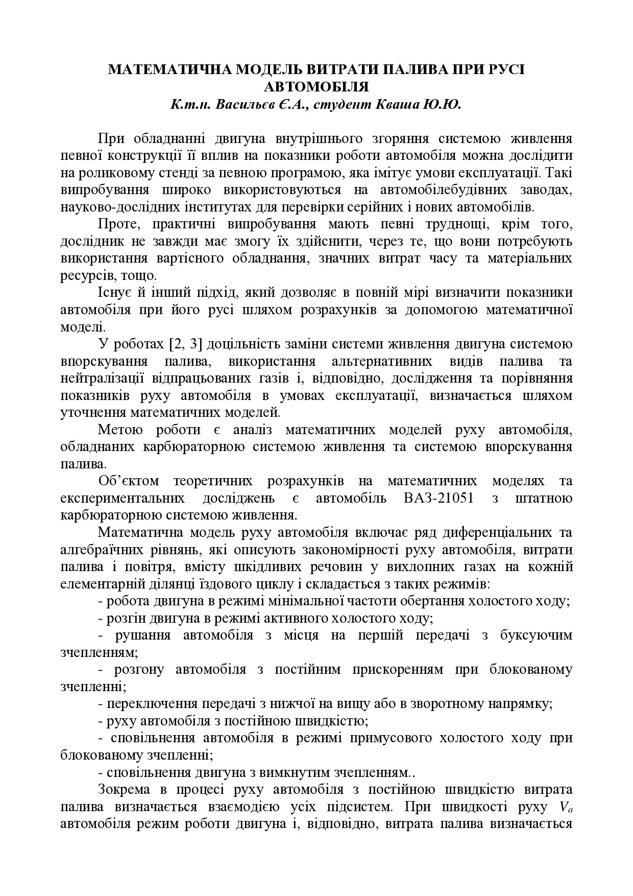 Математична модель витрати палива при русі автомобіля