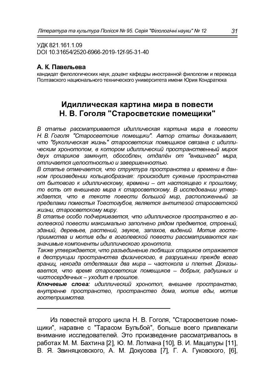 У статті розглядається ідилічна картина світу в повісті М. В. Гоголя «Старосвітські поміщики». Автор статті доводить, що «буколічне життя» старосвітських поміщиків пов'язане з ідилічним хронотопом, у якому структура простору й часу кільцеподібна: відбувається звуження простору від побутового до ідилічного, часу – від сьогодення – до минулого, тобто від зовнішнього світу – до старосвітського. При цьому зовнішній світ, розташований за межами маєтку Товстогубів, практично не деталізований; він відрізняється просторістю, невизначеністю і постає антитезою старосвітському життю, старосвітському світу. У статті особливо підкреслюється, що ідилічний простір у гоголівській повісті максимально заповнений рядом предметів, будинків, споруд, дерев, рослин, звуків, подій, видінь. Зазначається, що і зовнішній (простір маєтку), і внутрішній простір будинку зображені оповідачем із симпатією й ностальгією. У статті доводиться, що мотив гостинності й мотив їжі в гоголівській повісті є значимими компонентами ідилічного хронотопу. Також особливо підкреслюється, що роз'єднання люблячих старих, тобто надлам духовного, внутрішнього простору Афанасія Івановича відображається в деструкції фізичного простору, у руйнуванні насамперед меж, які колись відокремлювали два світи – частоколу й тину. Стверджується, що час старосвітських поміщиків – добрих, привітних і щиросердих – відходить у минуле. На останок відзначається, що таким чином Гоголь попрощався зі старою Україною у циклі «Миргород»: з одного боку, героїчним хронотопом «Тараса Бульби», з іншого боку, ідилічним хронотопом «Старосвітських поміщиків».