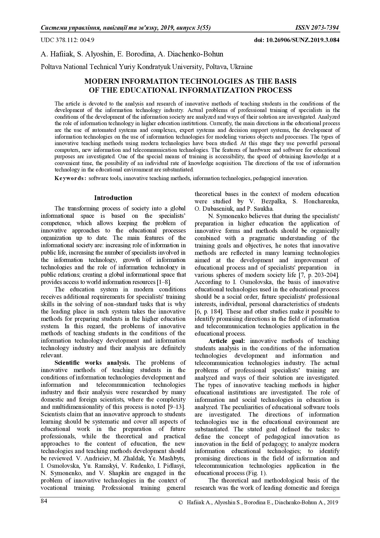 Hafiiak A.M. Modern information technologies as the basis of the educational informatization process / A.M. Hafiiak , S.P. Alyoshin, E.A. Borodina, A.O. Diachenko-Bohun // Системи управління, навігації та зв’язку. – 2019 – Вип. 3(55). – С. 84-89