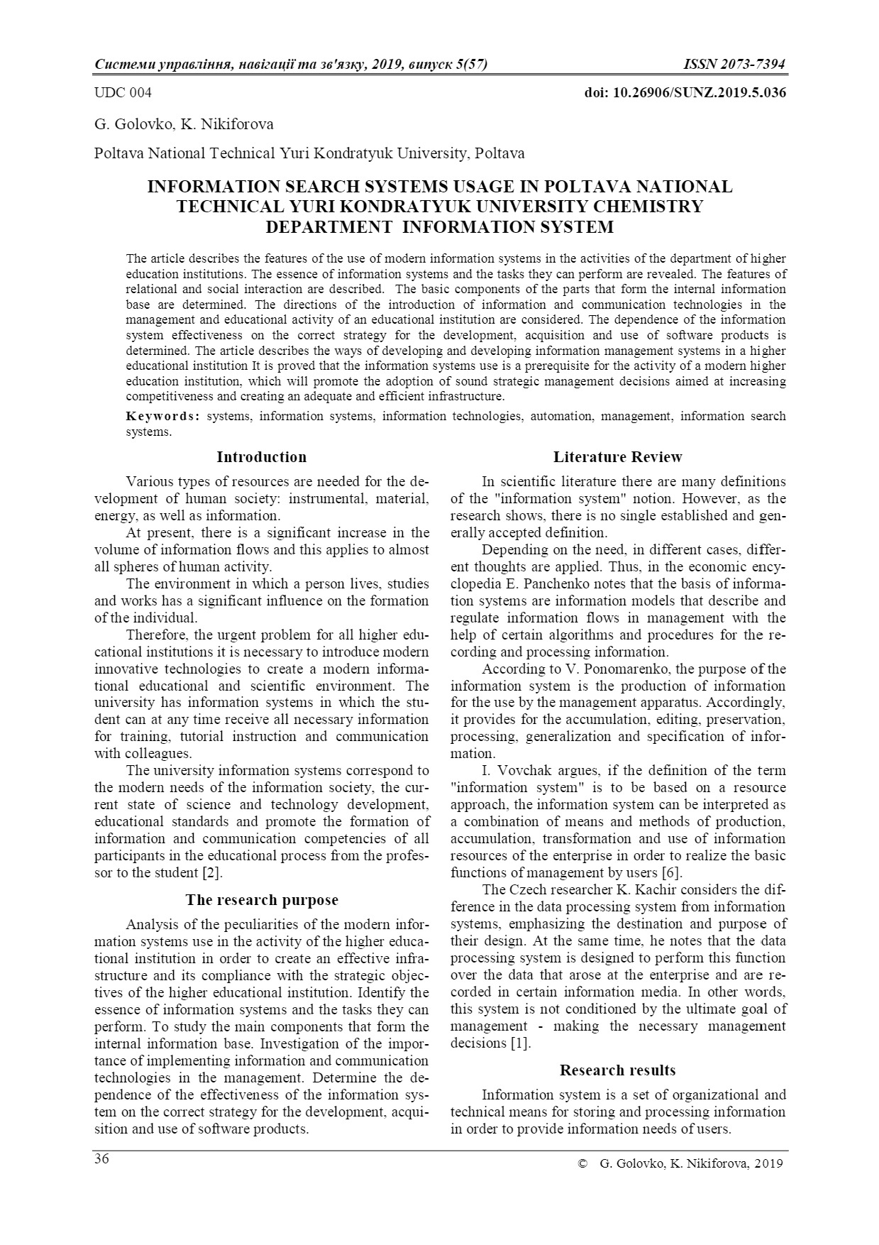 Golovko G.V. Information search systems usage in Poltava National Technical Yuri Kondratyuk university chemistry department information system / G.V. Golovko, K.N. Nikiforova // Системи управління, навігації та зв'язку. – 2019. – № 5 (57). – С. 36-39. – doi: 10.26906/SUNZ.2019.5.036.