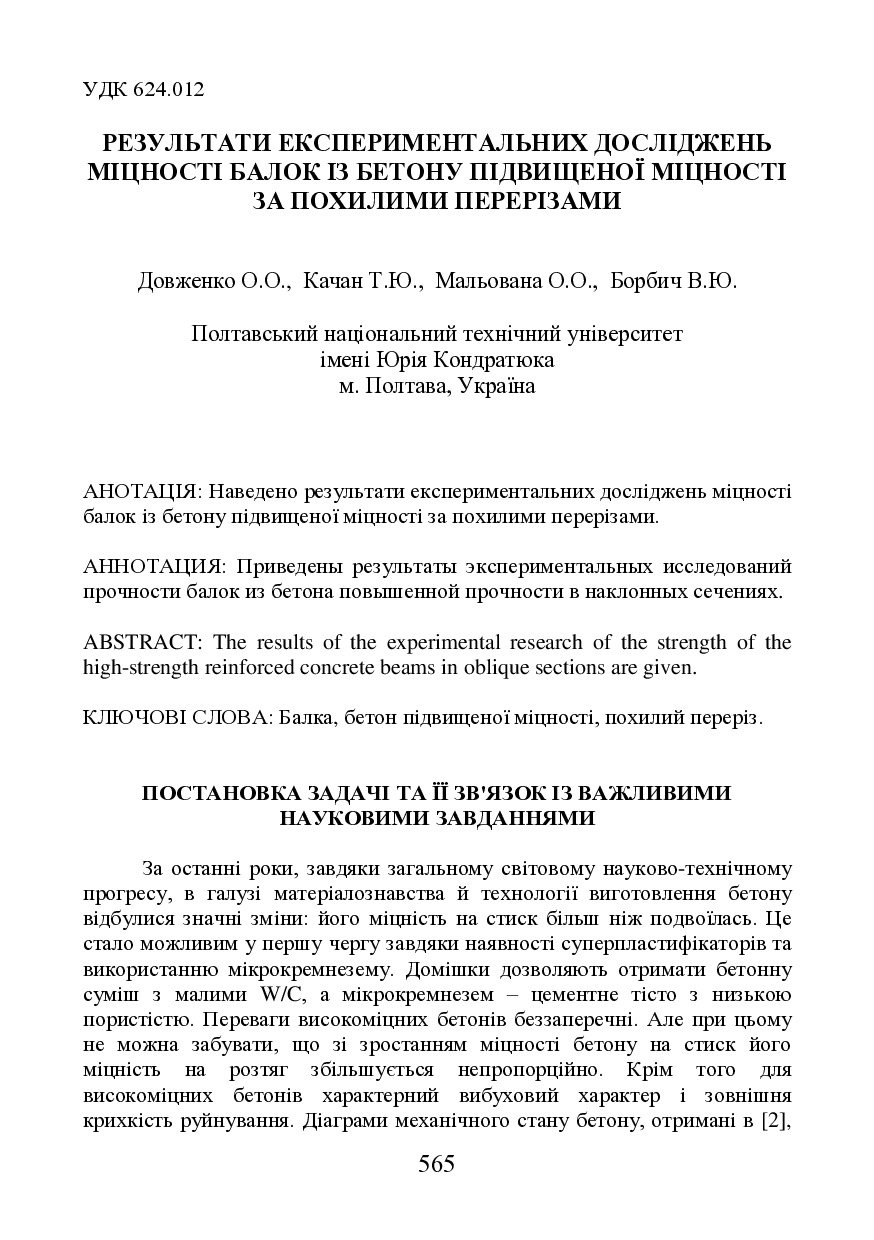 Результати експериментальних досліджень міцності балок із високоміцного бетону за похилими перерізами