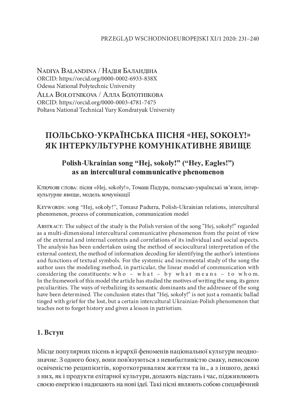 Польсько-українська пісня «Hej, sokoły!» як інтеркультурне комунікативне явище = Polish-ukrainian song «Hej, sokoły!» («Hey, Eagles!») as an intercultural