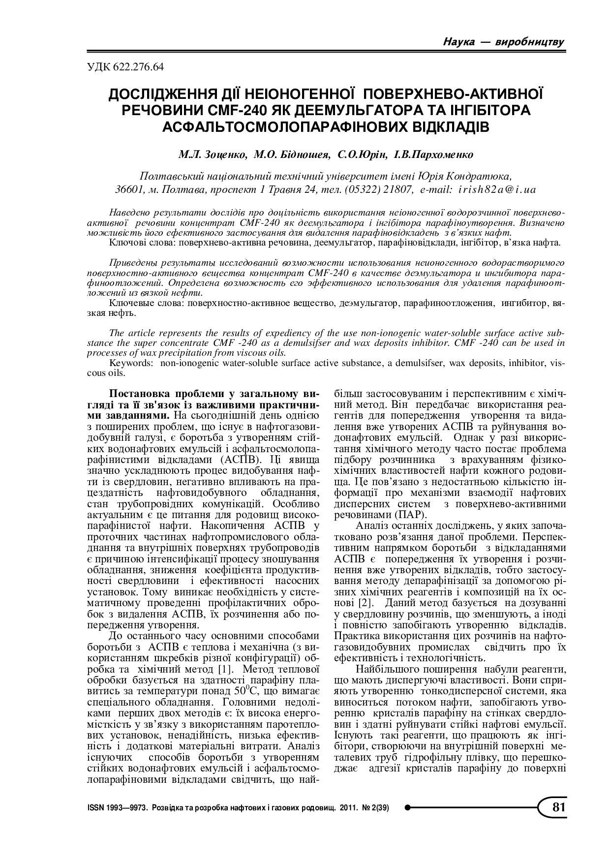 Дослідження дії неіоногенної поверхнево-активної речовини CMF-240 як деемульгатора та інгібітора асфальтосмолопарафінових відкладів