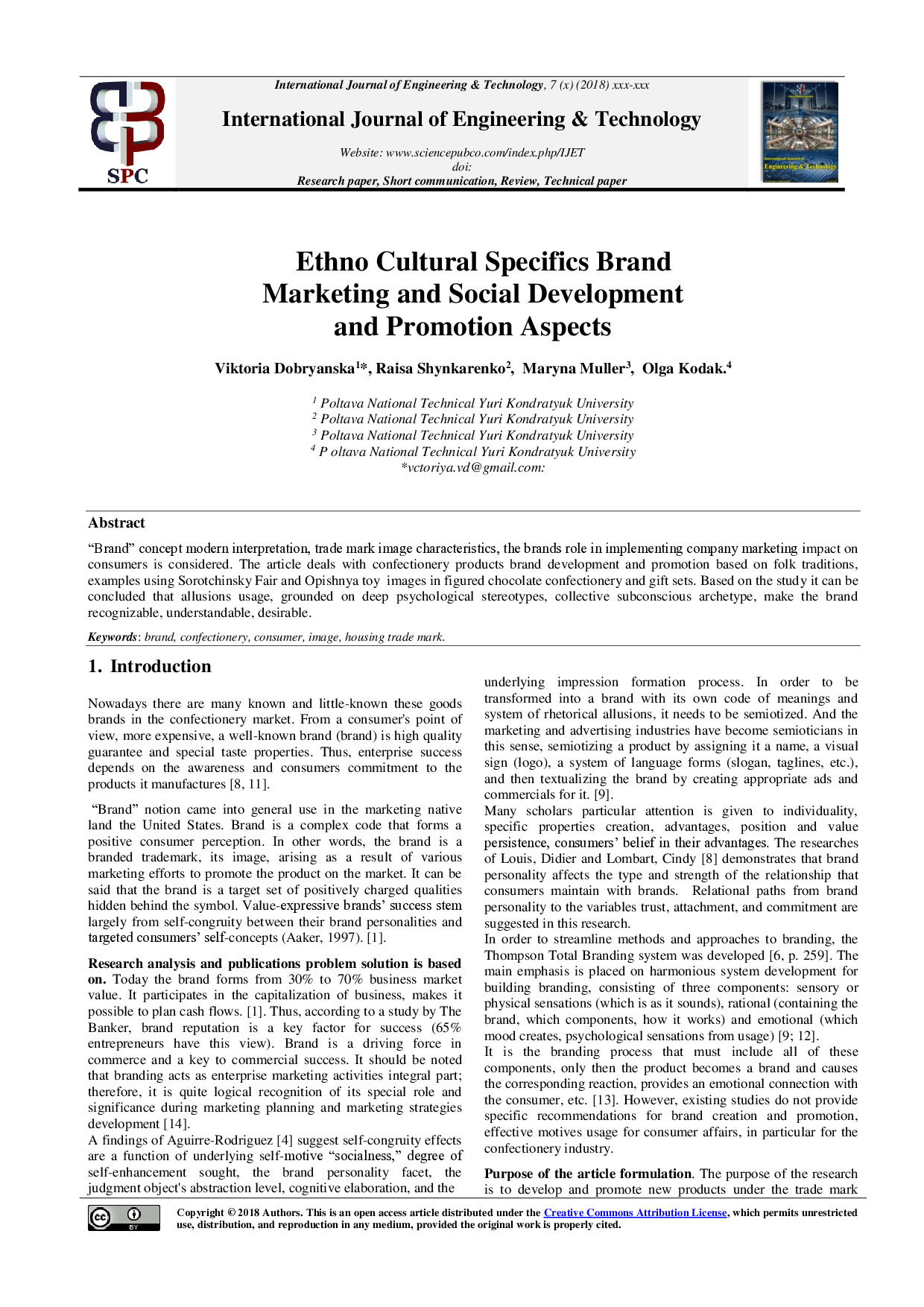 Dobryanskaya V.V. Ethno Cultural Specifics Brand Marketing and Social Development and Promotion Aspects / V.V. Dobryanskaya, R.V. Shunkarenko, M.V. Muller, O.A. Kodak // International Journal of Engineering & Technology. – 2018. – Vol. 7, № 4.8. – P. 258-262.