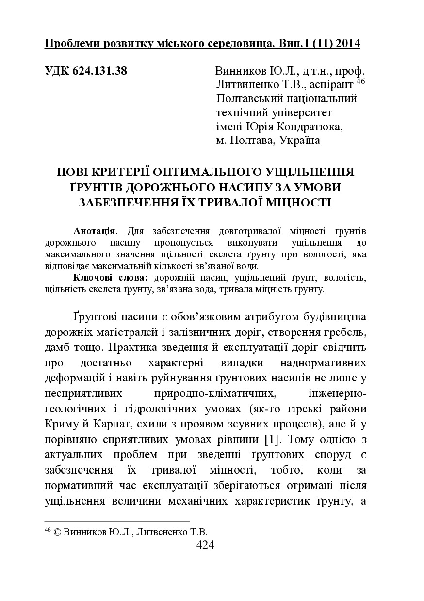 Нові критерії оптимального ущільнення грунтів дорожнього насипу за умови забезпечення їх тривалої міцності