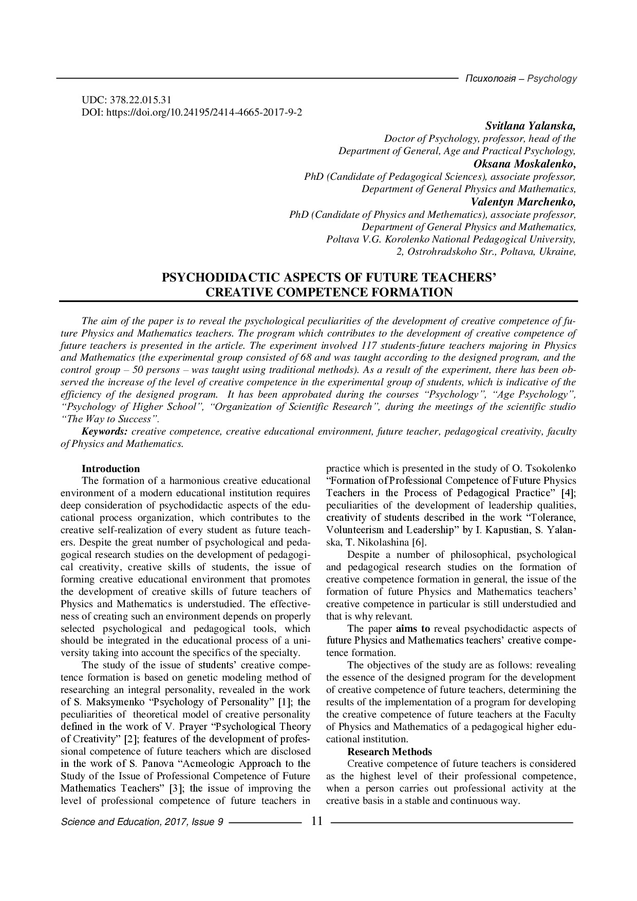 Yalanska S.P. Psychodidactic Aspects of Future Teachers’ Creative Competence Formation [Електронний ресурс] / S.P. Yalanska, O.A. Moskalenko, V.O. Marchenko // Наука і освіта. – 2017. – № 9. – С. 11-15. – Режим доступу : https://scienceandeducation.pdpu.edu.ua/articles/2017-9-doc/2017-9-st2