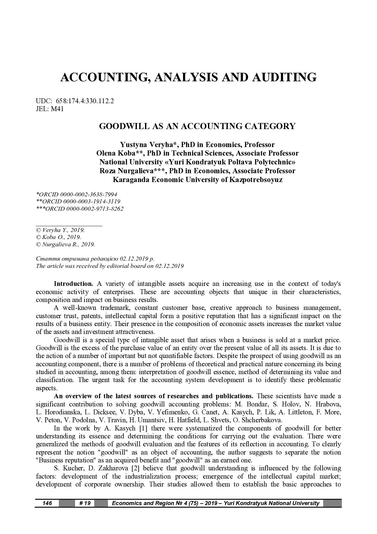 Veryha Yu.A. Goodwill as an accounting category / Yu.A. Veryha, O.V. Koba, R.N. Nurgalieva // Економіка і регіон. – 2019. – Вип. 4 (75). – С. 146-150.