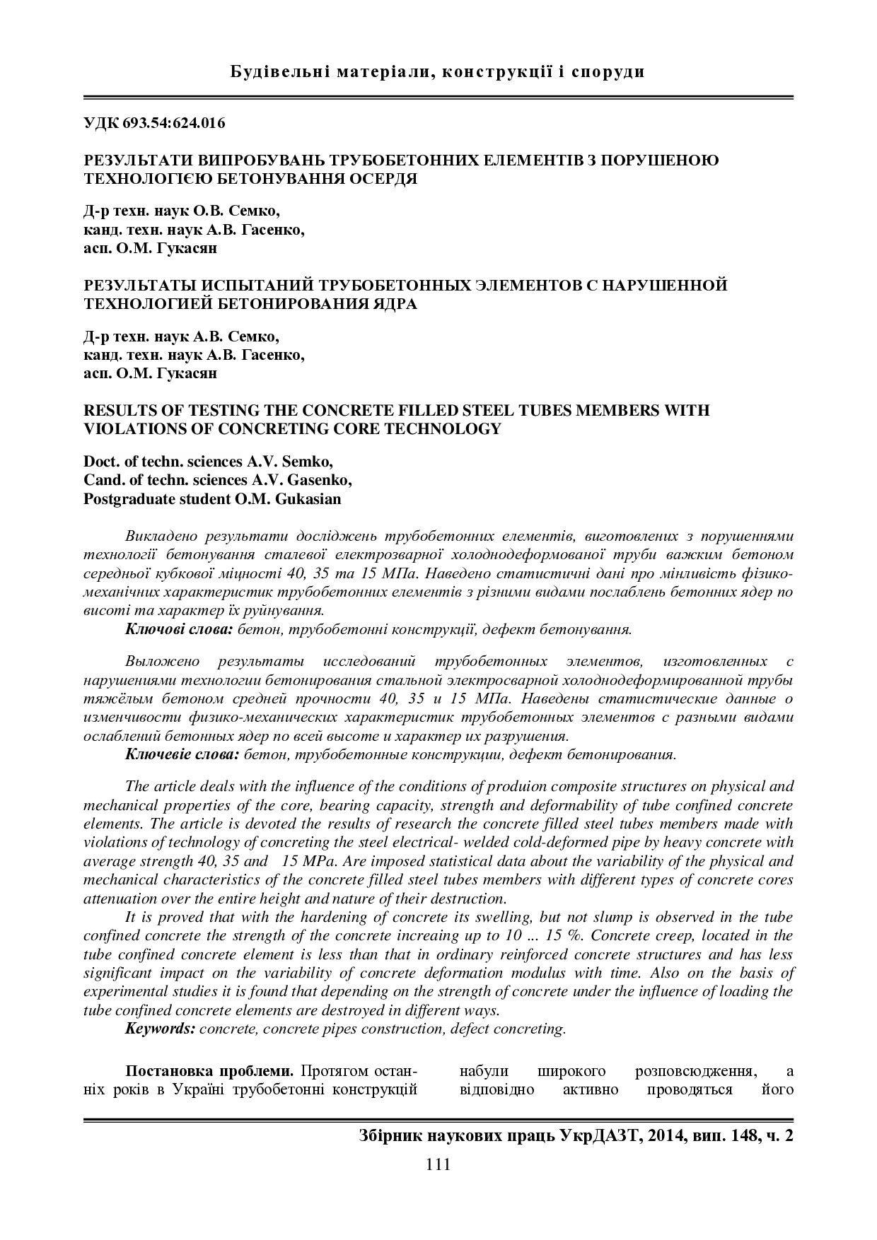 Результати випробувань трубобетонних елементів з порушеною технологією бетонування осердя