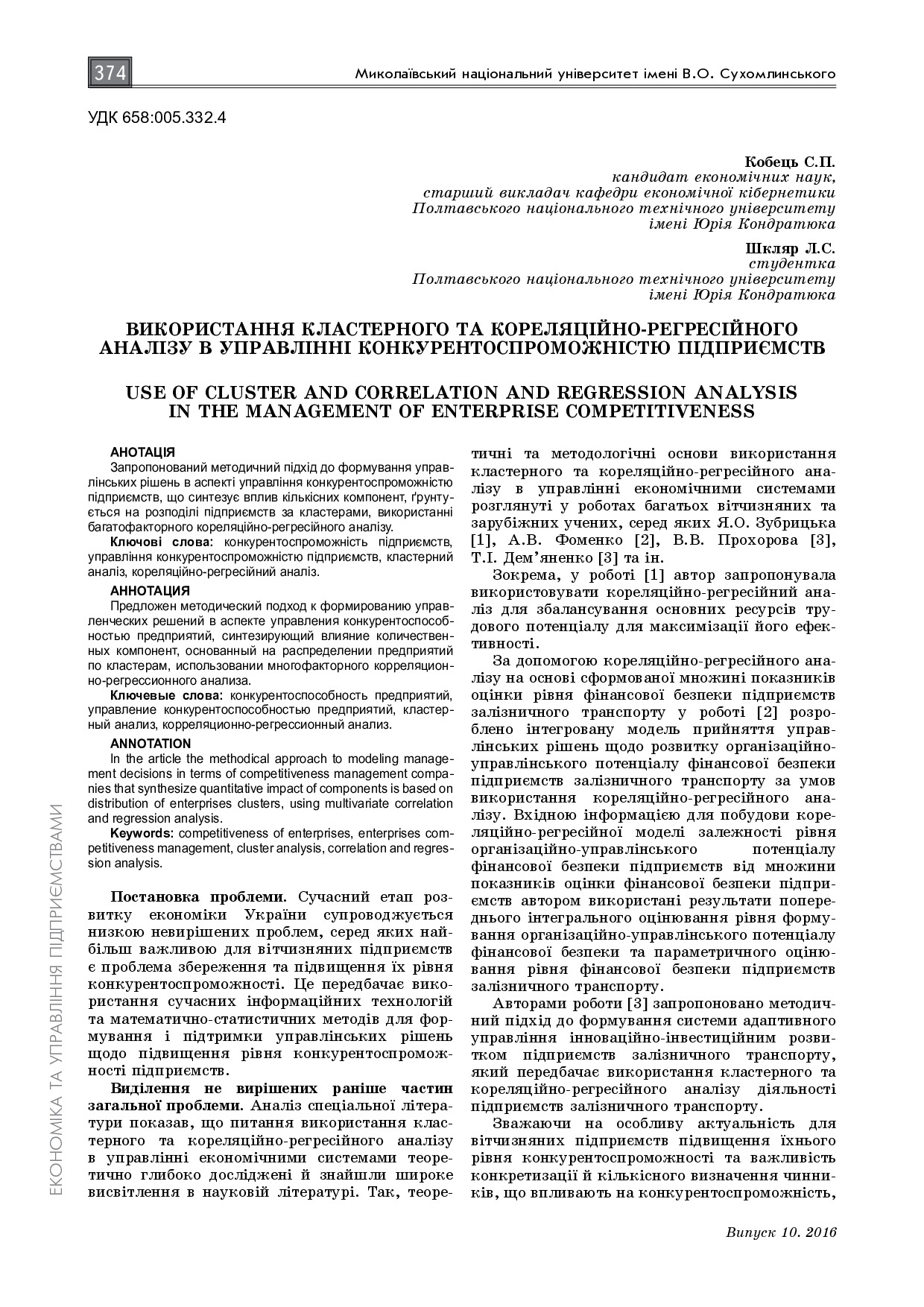 Використання кластерного та кореляційно-регресійного аналізу в управлінні конкурентоспроможністю підприємств