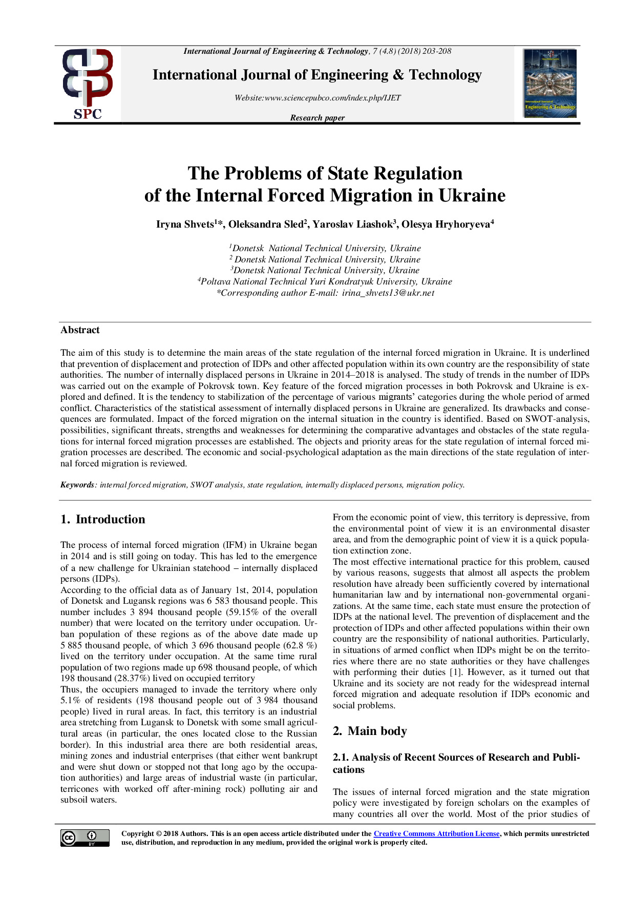 The problems of state regulation of the internal forced migration in Ukraine / I.B. Shvets, O. Sled, Y.A. Liashok, O.V. Hryhoryeva // International Journal of Engineering & Technology. – 2018. – Vol. 7, № 4.8. – P. 203-208. – DOI: 10.14419 / ijet.v7i4.8.27241