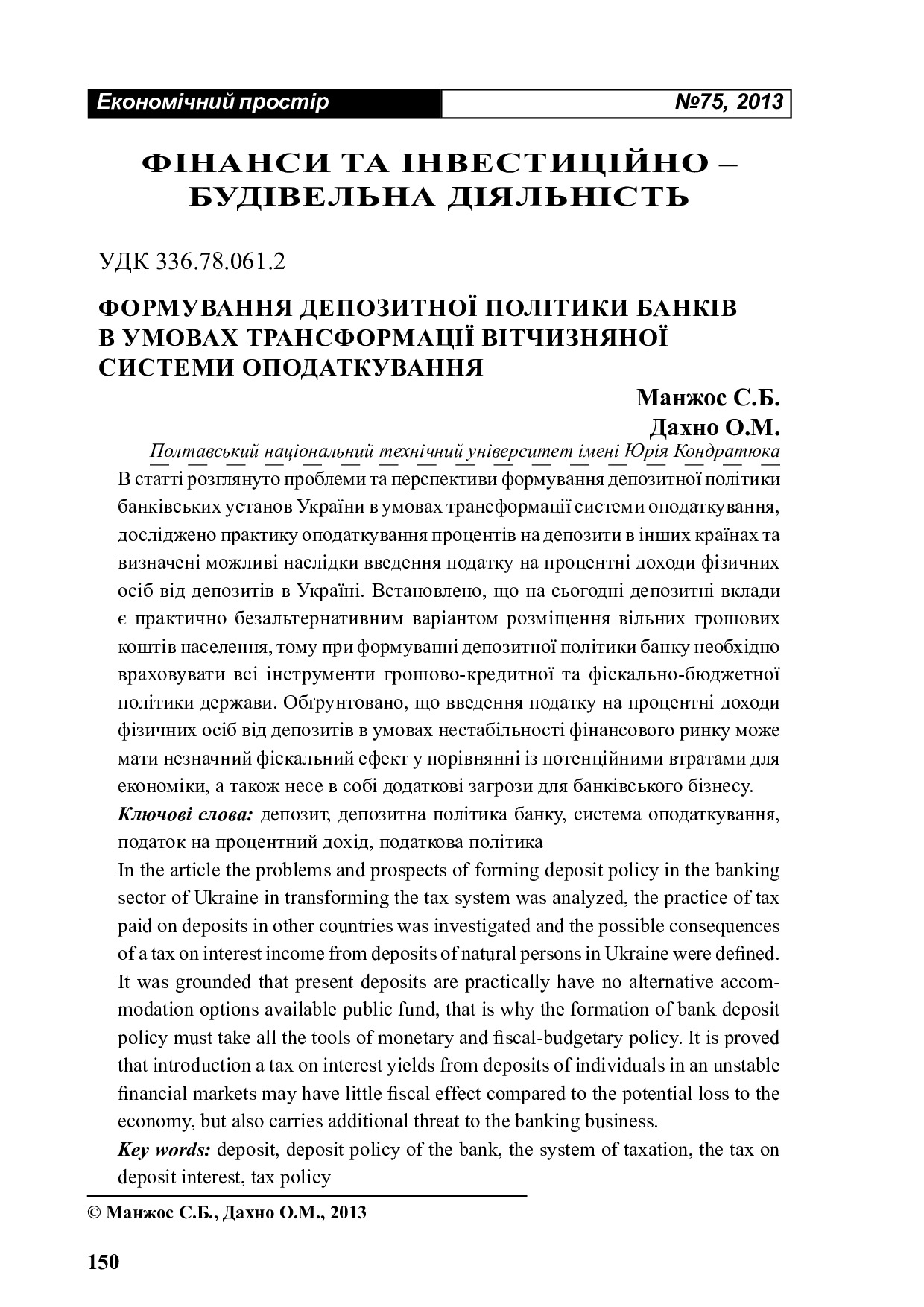 Формування депозитної політики банків в умовах трансформації вітчизняної системи оподаткування