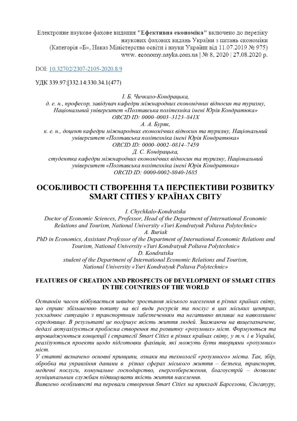 Чичкало-Кондрацька І.Б. Особливості створення та перспективи розвитку smart cities у країнах світу [Електронний ресурс] / І.Б. Чичкало-Кондрацька, А.А. Буряк, Д.С. Кондрацька // Ефективна економіка. – 2020. – № 8. – URL: http://www.economy.nayka.com.ua/?op=1&z=8096
