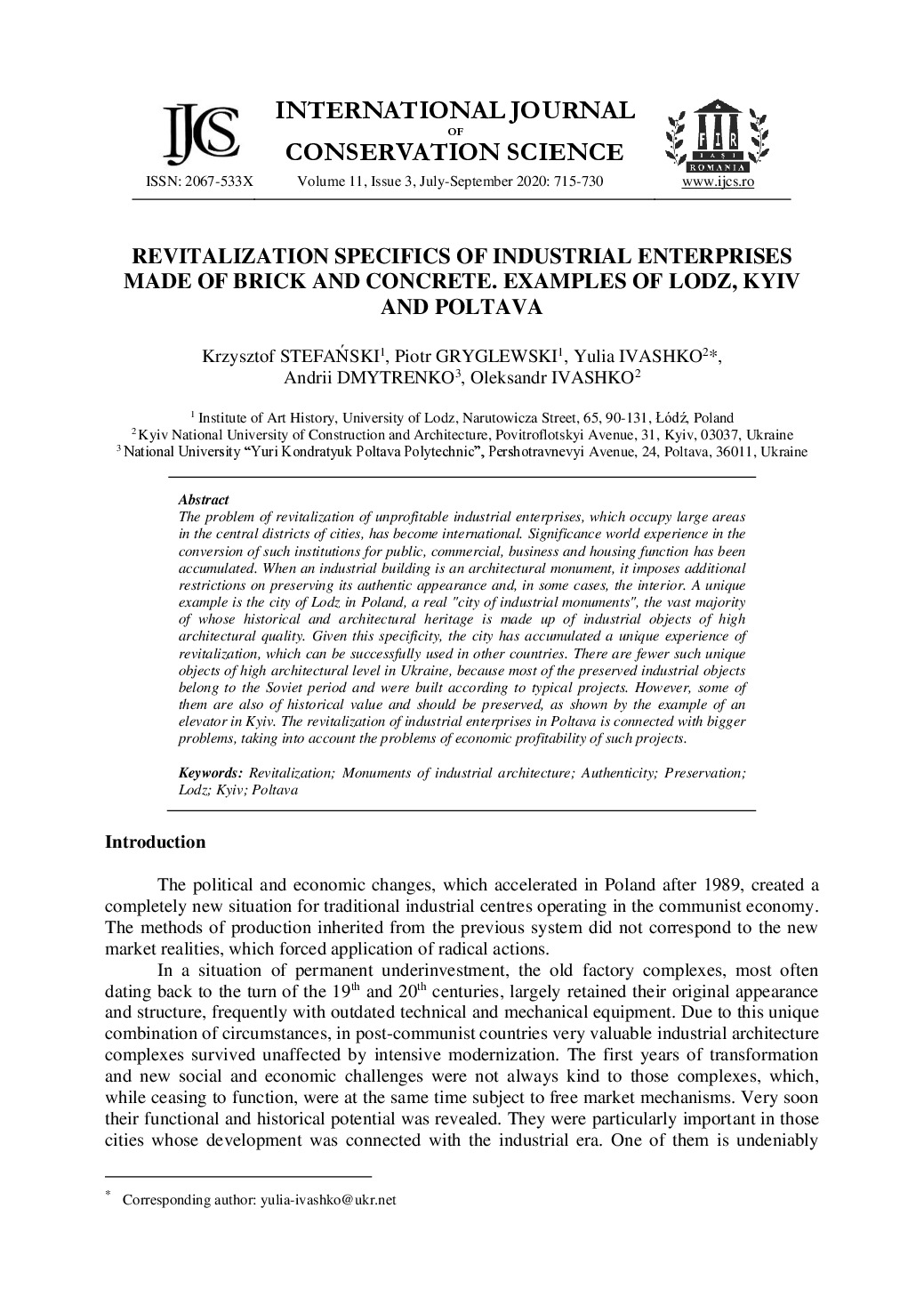 Revitalization specifics of industrial enterprises made of brick and concrete. Examples of Lodz, Kyivand Poltava / Krzysztof Stefański, Piotr Gryglewski, Yulia Ivashko, Andrii Dmytrenko, Oleksandr Ivashko // International Journal of Conservation Science. – 2020. – Vol. 11, Issue 3. – P. 715-730.