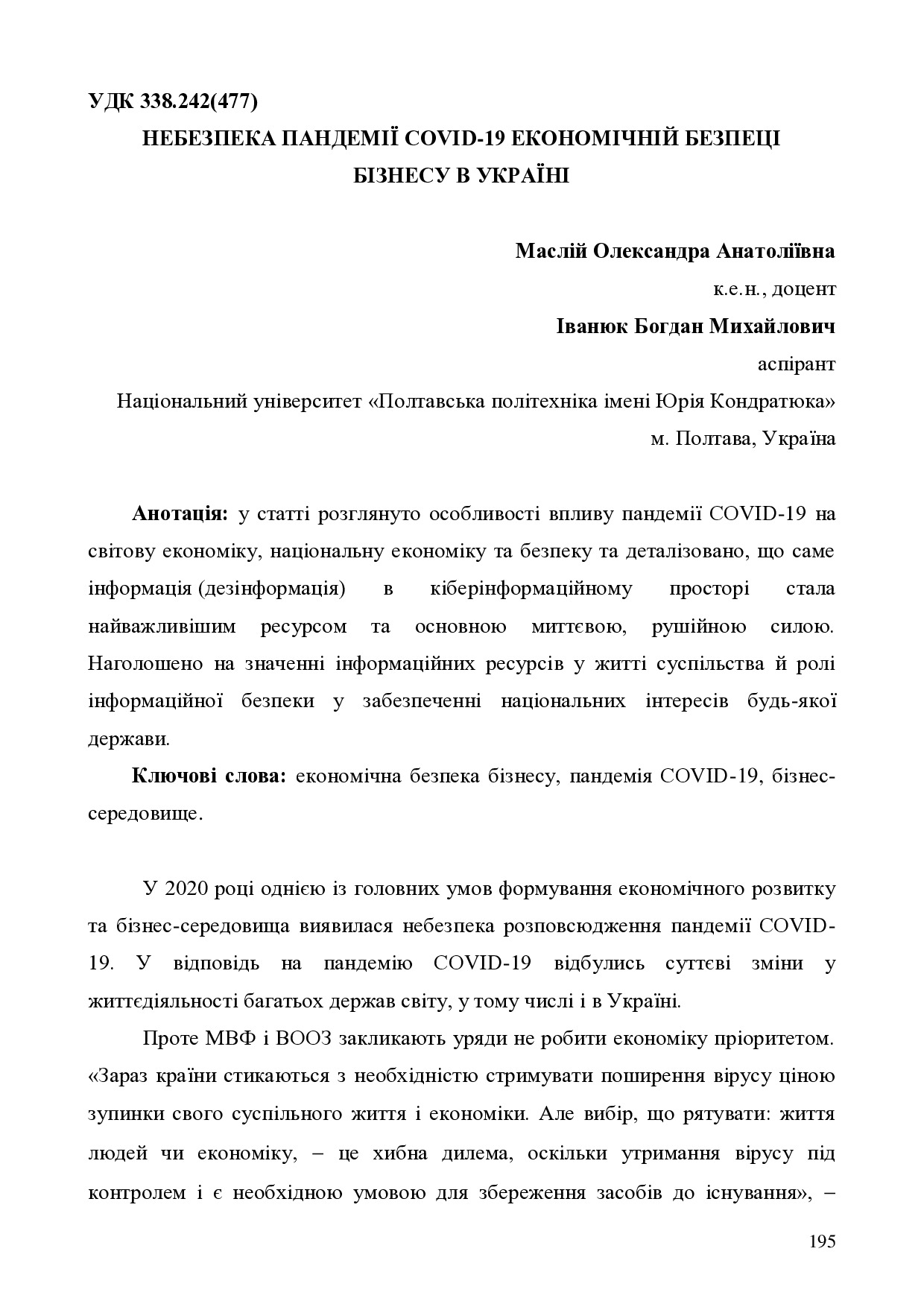 Небезпека пандемії COVID-19 економічній безпеці бізнесу в Україні