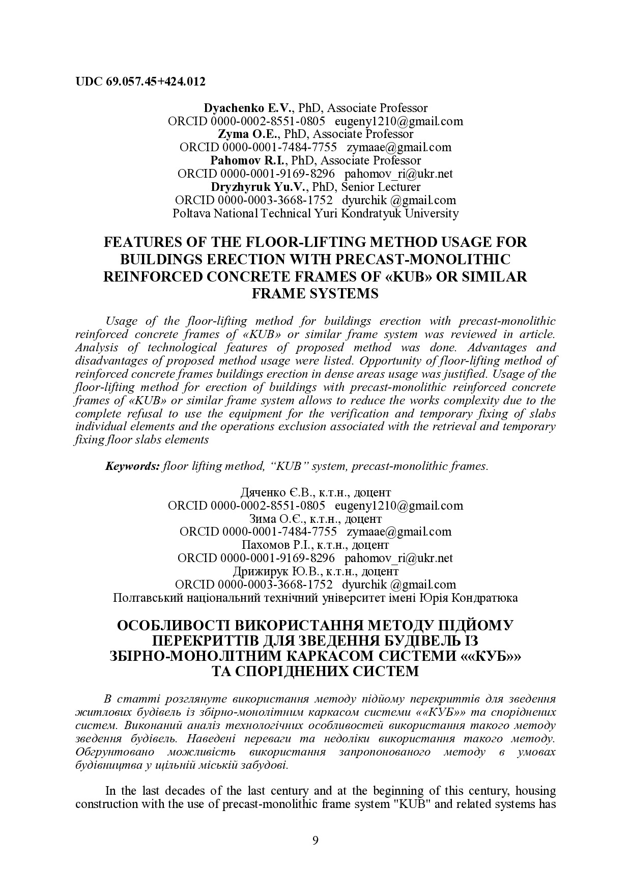 Features of the floor-lifting method usage for buildings erection with precast-monolithic reinforced concrete frames of «KUB» or similar frame systems