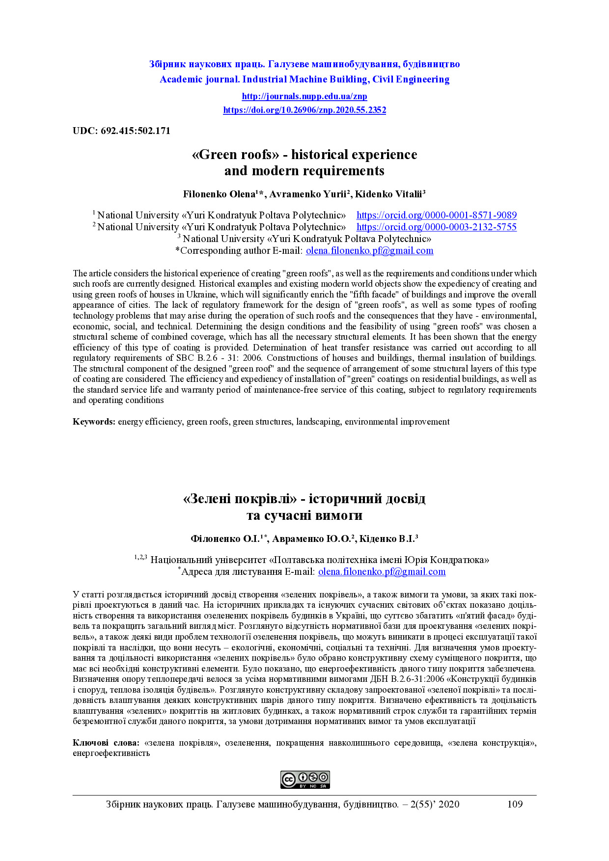Filonenko O.I. «Green roofs» - historical experience and modern requirements / O.I. Filonenko, Yu.O. Avramenko, V.I. Kidenko // Збірник наукових праць. Галузеве машинобудування, будівництво. – 2020. – № 2 (55). – С. 109-114/