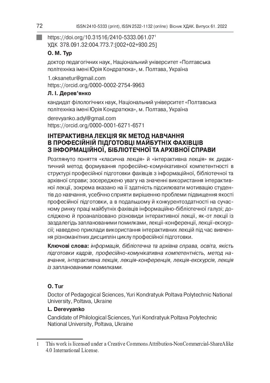 Інтерактивна лекція як метод навчання в професійній підготовці майбутніх фахівців з інформаційної, бібліотечної та архівної справи