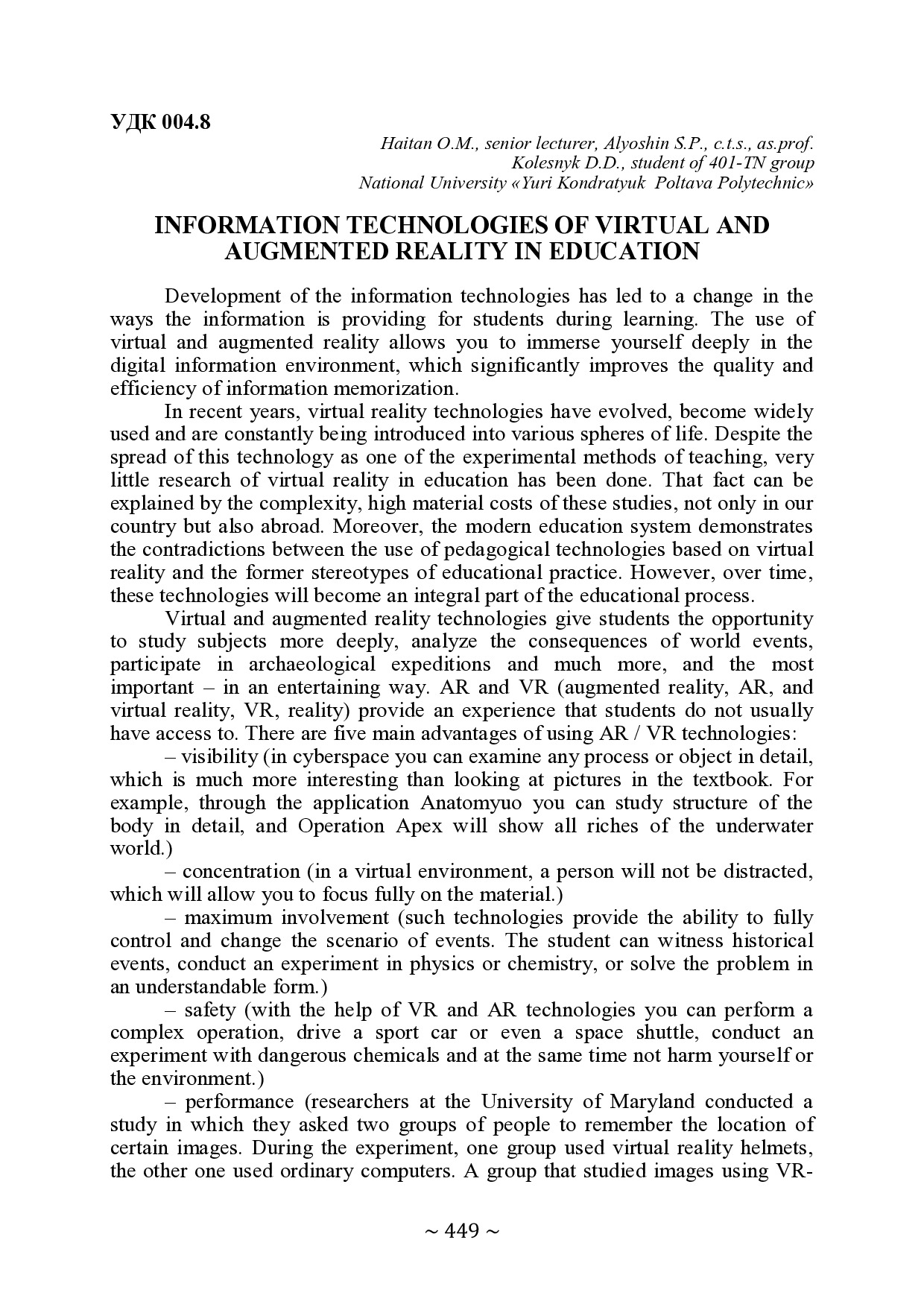 Information technologies of virtual and augmented reality in education