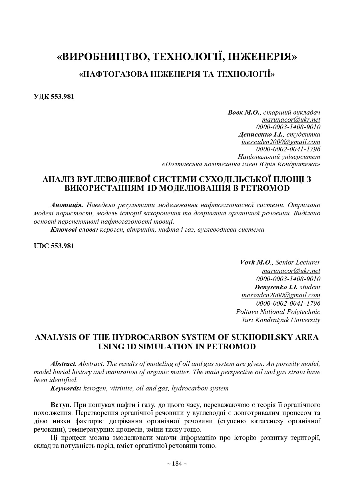 Аналіз вуглеводневої системи Суходільської площі з використанням 1D моделювання в PetroMod