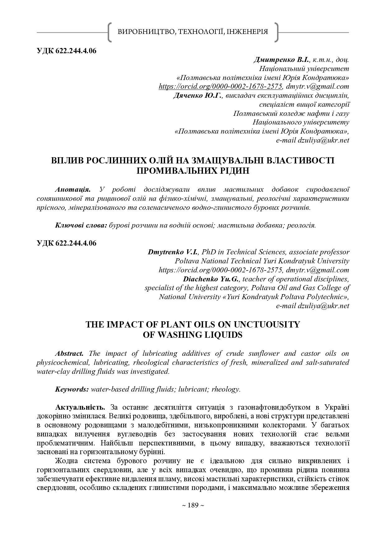 Вплив рослинних олій на змащувальні властивості промивальних рідин