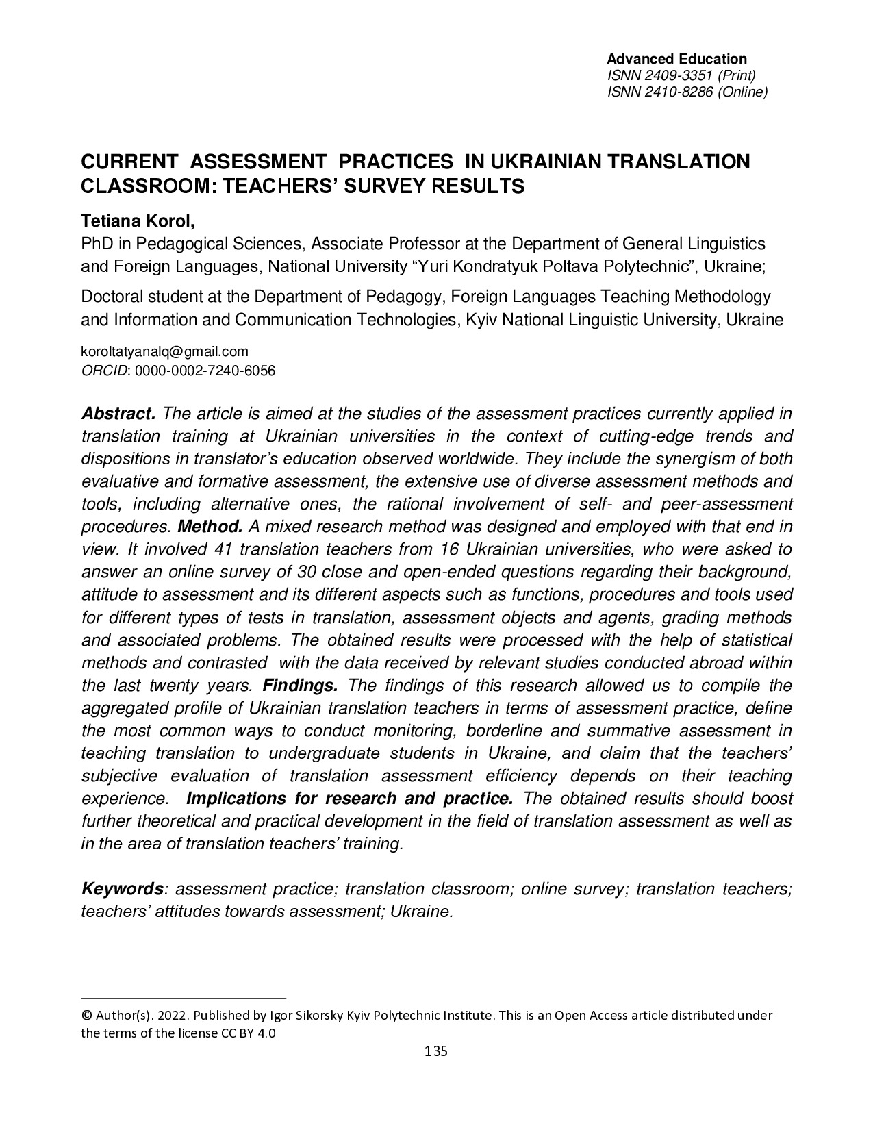 Current assessment practices in Ukrainian translation classroom: teachers’ survey results