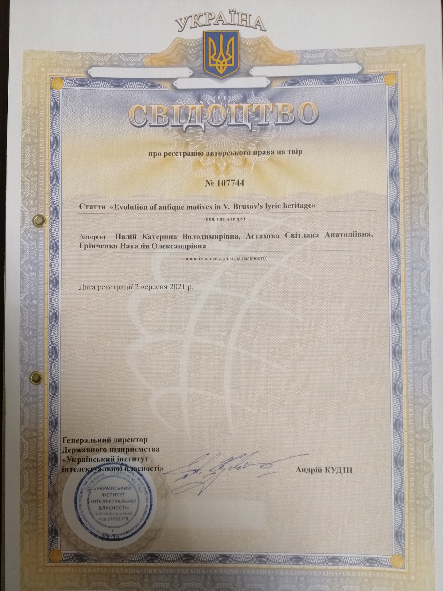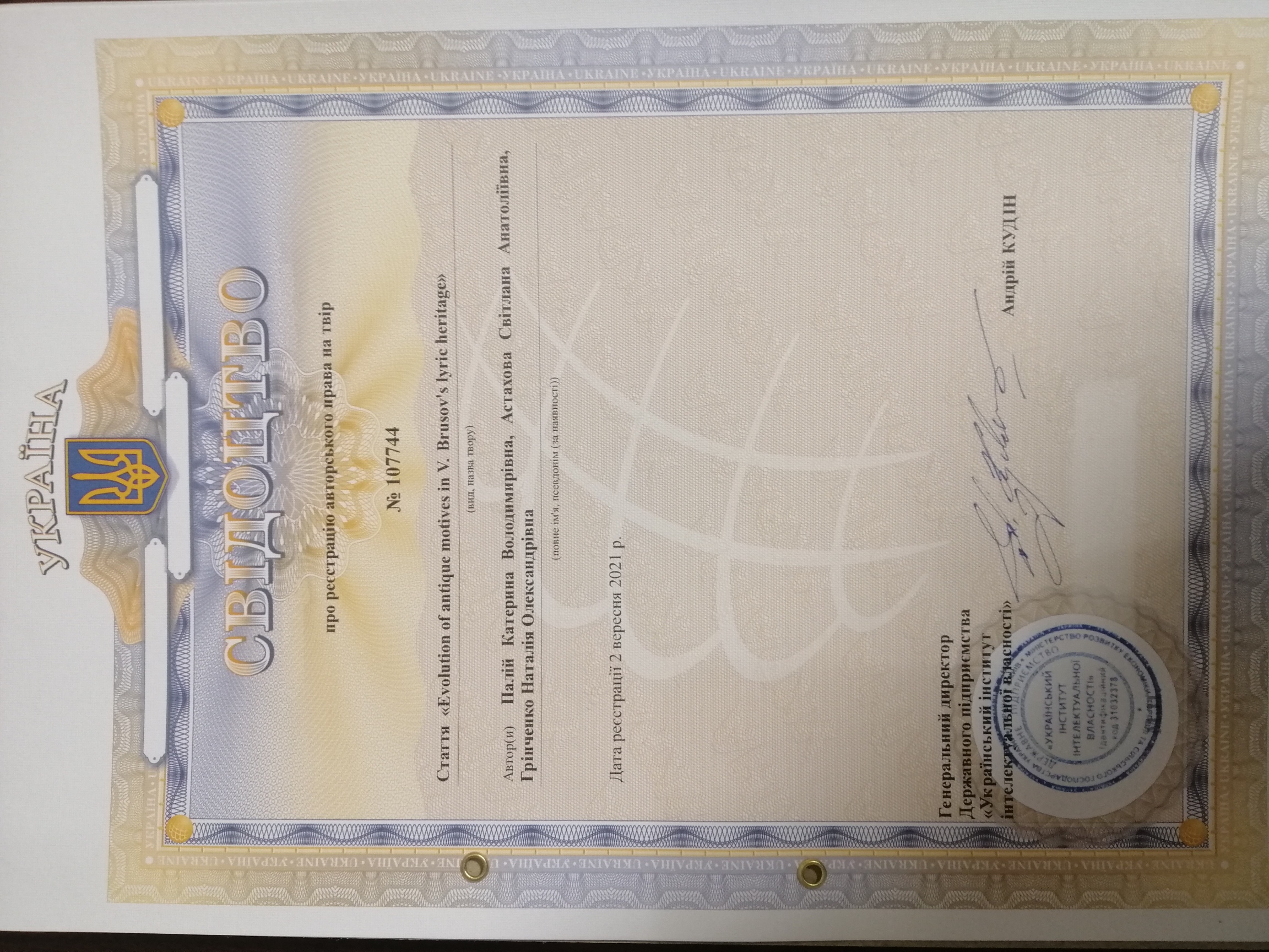 Свідоцтво про реєстрацію авторського права № 107744