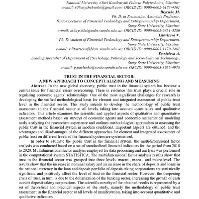 Іn the new global economy, public trust in the financial system has become a central issue for financial crises overcoming. There is evidence that trust plays a crucial role in regulating economic ...