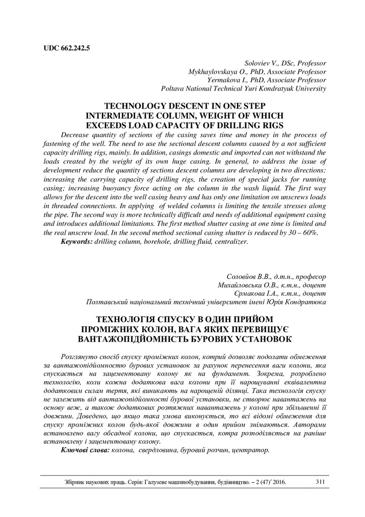 The way of the intermediate casing string descending is considered. It allows overcoming the limits of derrick load capacity through the weight transferring descending intermediate casing string o...