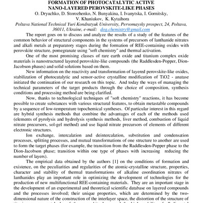 Стаття 2021/09/08Features of transformations in systems of nitrate precursors of lanthanoids and alkaline metals in the formation of photocatalytic active nano-layered perovskite-like phases