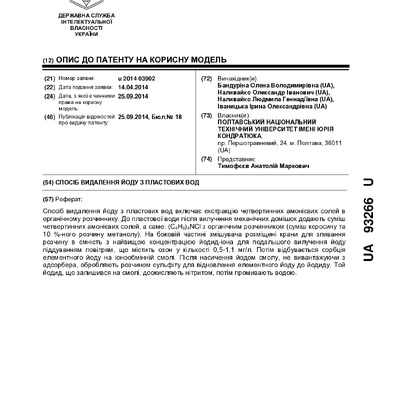 Стаття 2020/10/14Спосіб видалення йоду з мінералізованих пластових вод : пат. 89468