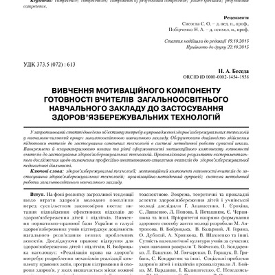 2019/09/24Вивчення мотиваційного компоненту готовності вчителів загальноосвітнього закладу до застосування здоров`язбережувальних технологій