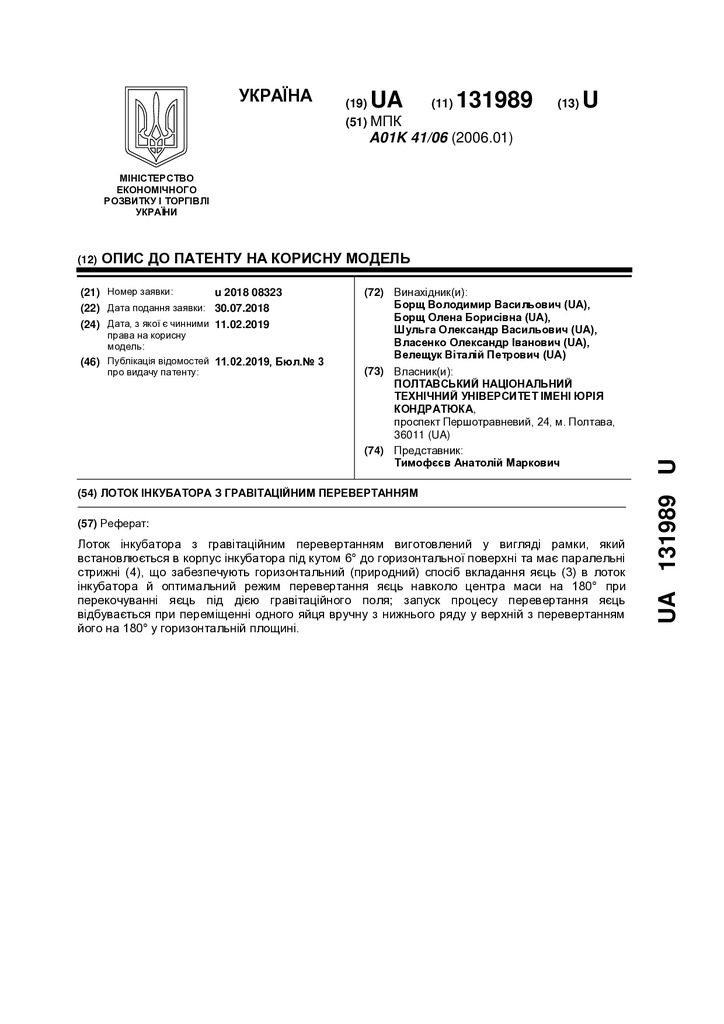 Корисна модель належить до елементів конструкції інкубаторів, які використовуються в птахівництві, птахофабриках або для селекційного виведення домашньої птиці в невеликих кількостях та на індивіду...