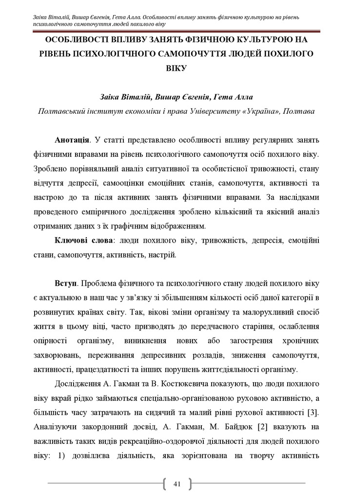 Особливості впливу занять фізичною культурою на рівень психологічного самопочуття людей похилого віку