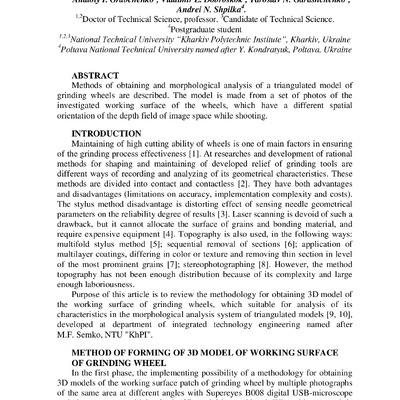 Methods of obtaining and morphological analysis of a triangulated model of grinding wheels are described. The model is made from a set of photos of the investigated working surface of the wheels, w...