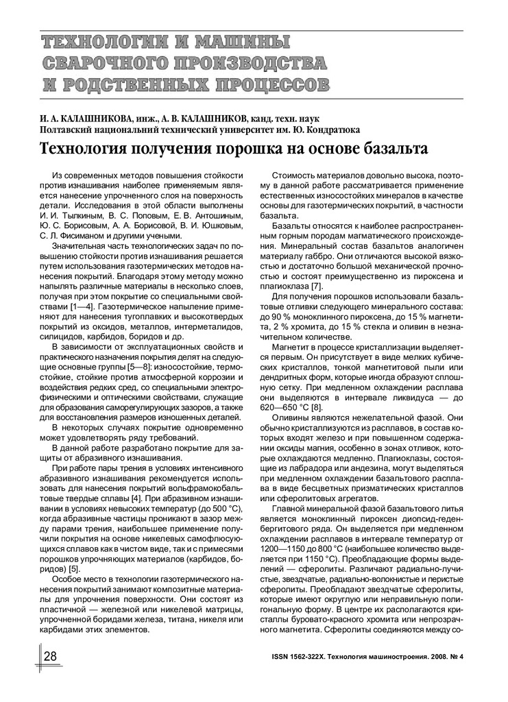 Стаття 2019/04/18A technology for producing basalt-based powders for thermal spraying of wear-resisting coatings