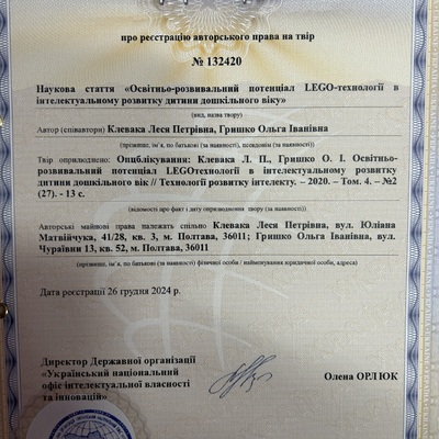2025/02/05Свідоцтво про реєстрацію авторськоко права № 132420 на твір «Освітньо-розвивальний потенціал LEGO-технології в інтелектуальному розвитку дитини дошкільного віку»