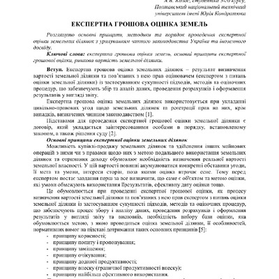 Розглянуто основні принципи, методики та порядок проведення експертної оцінки земельних ділянок ...